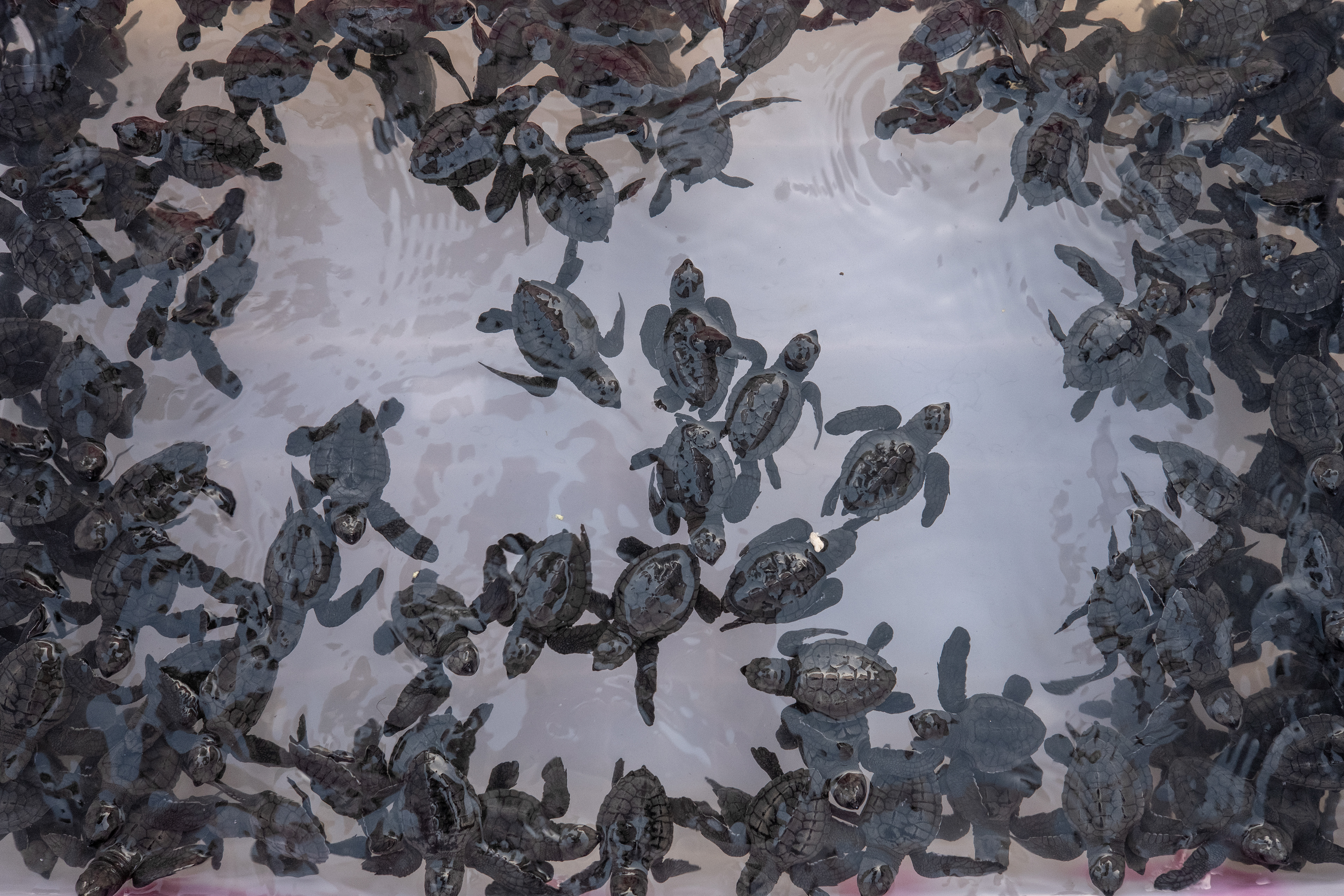 Newly hatched sea turtles, which are ready to be released into the wild, swim at a conservation center in Kuta